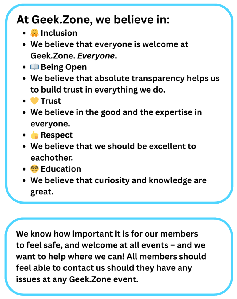 We know how important it is for our members to feel safe, and welcome at all events – and we want to help where we can! All members should feel able to contact us should they have any issues at any Geek.Zone event.
