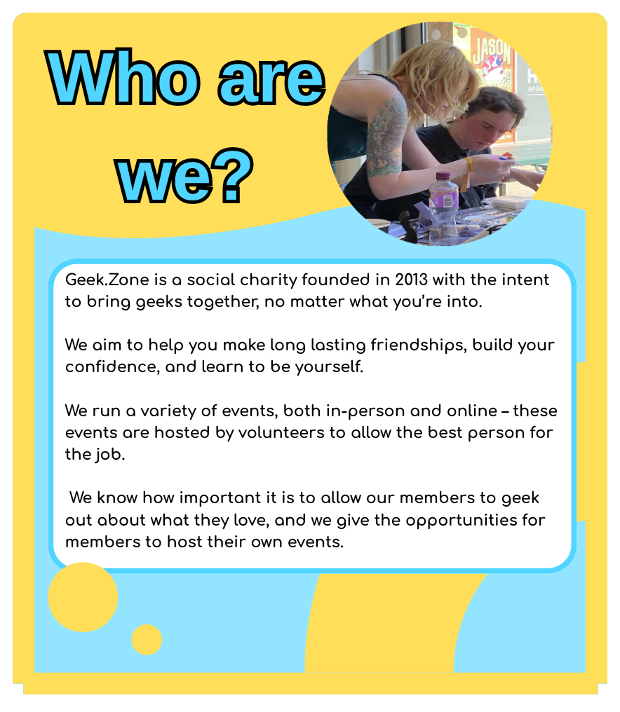 Geek.Zone is a social charity founded in 2013 with the intent to bring geeks together, no matter what you’re into. We aim to help you make long lasting friendships, build your confidence, and learn to be yourself.